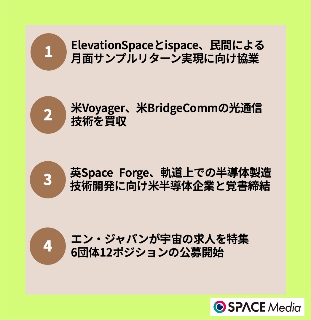 9/26宇宙ニュース・ElevationSpaceとispace、民間による月面サンプルリターン実現に向け協業 ほか3件