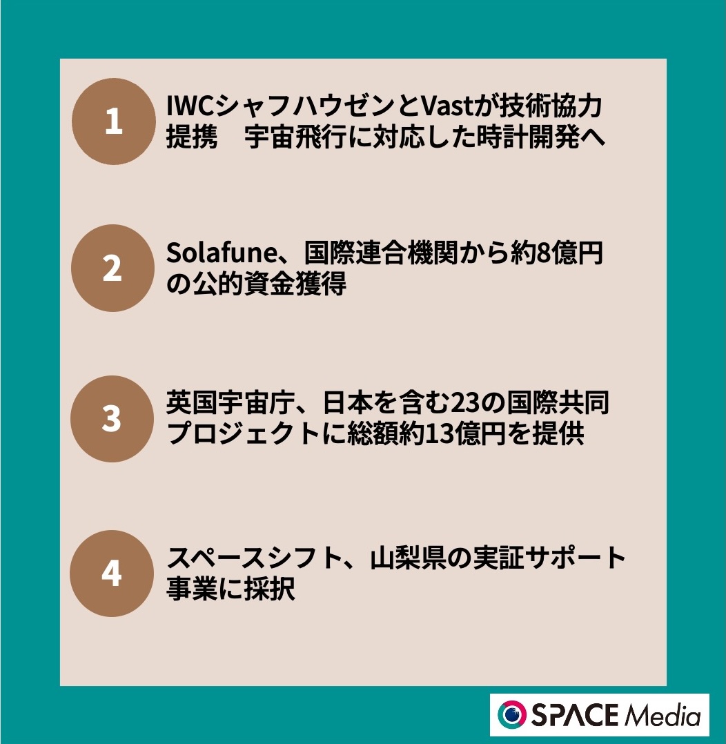 10/2宇宙ニュース・IWCシャフハウゼンとVastが技術協力提携 宇宙飛行に対応した時計の開発へ ほか3件