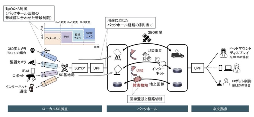 こうした背景で実施された今回の実証では、GEO衛星・LEO衛星・地上設備(ローカル5Gシステム)を相互に接続したネットワークの構築・実証のため、用途に応じたバックホール経路の割り当て、バックホール回線の帯域幅に応じた動的なQoS(Quality of Service)制御など、次世代通信技術の検証を行い、すべての実証に成功したということです。