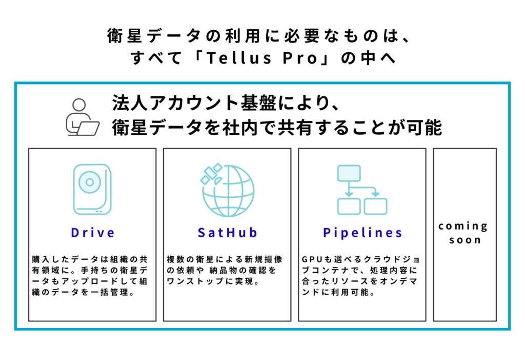 「Tellus Pro」では今回、衛星データのストレージサービス「Drive(ドライブ)」と新規撮像を直接購入できる「SatHub(サットハブ)」、衛星データの前処理や分析をクラウド上で実行する「Pipelines(パイプライン)」の3つの機能を提供。