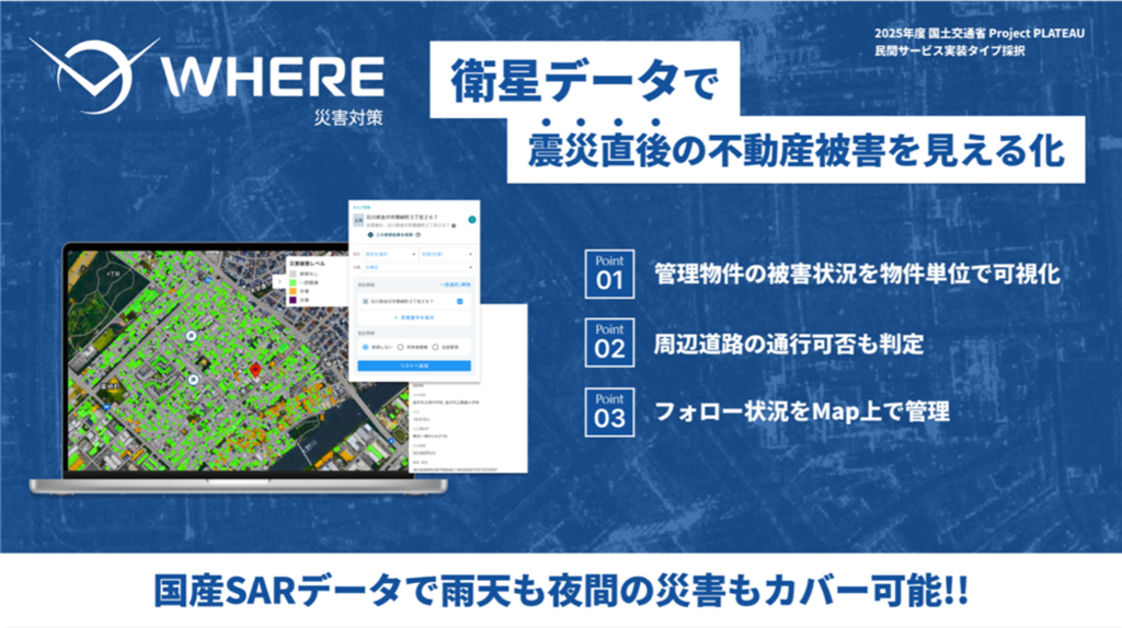 具体的には、災害直後の合成開口レーダー(SAR)衛星の画像を元に、物件ごとに「被害なし/被害小/被害中/被害大」を自動で分類する「被害度レイヤー」、被害情報をもとに物件ごとのフォロー状況を記録・管理できる「ステータス管理」、各不動産会社や自治体が保有する物件リストをインポートしたり、付与された被害状況を書き出せる「インポート/エクスポート」機能があり、WHEREは、同サービスの提供により地方公共団体・民間企業双方における災害復旧の早期化を支援していくとしています。