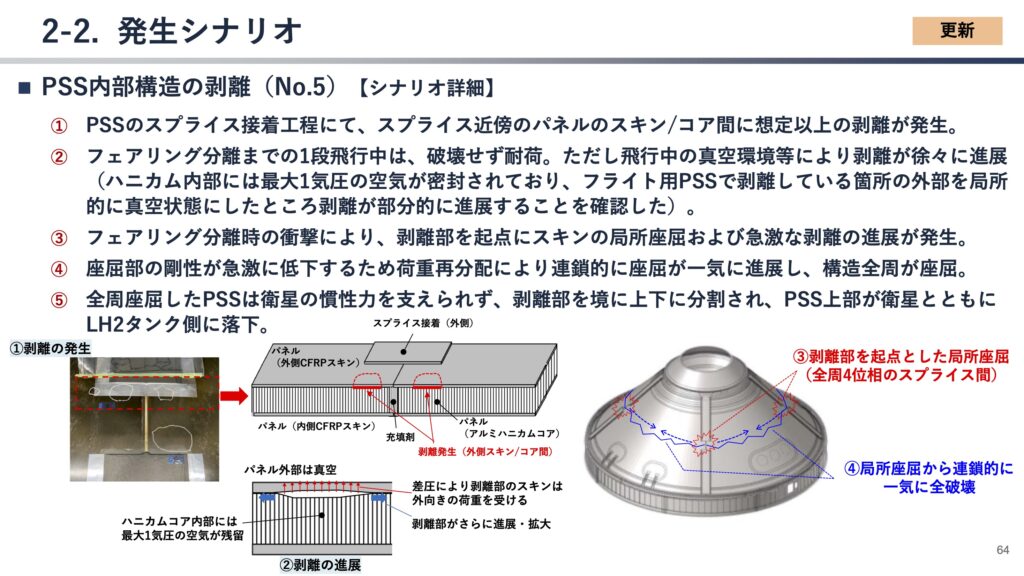 JAXAによると、調査の結果、PSS内部で部品(CFRPスキンとハニカムコア)の接着不良による剥離が発生し、フェアリング分離時の衝撃で剥離が急速に進み、構造全体の破壊に至った可能性が高いとのこと。