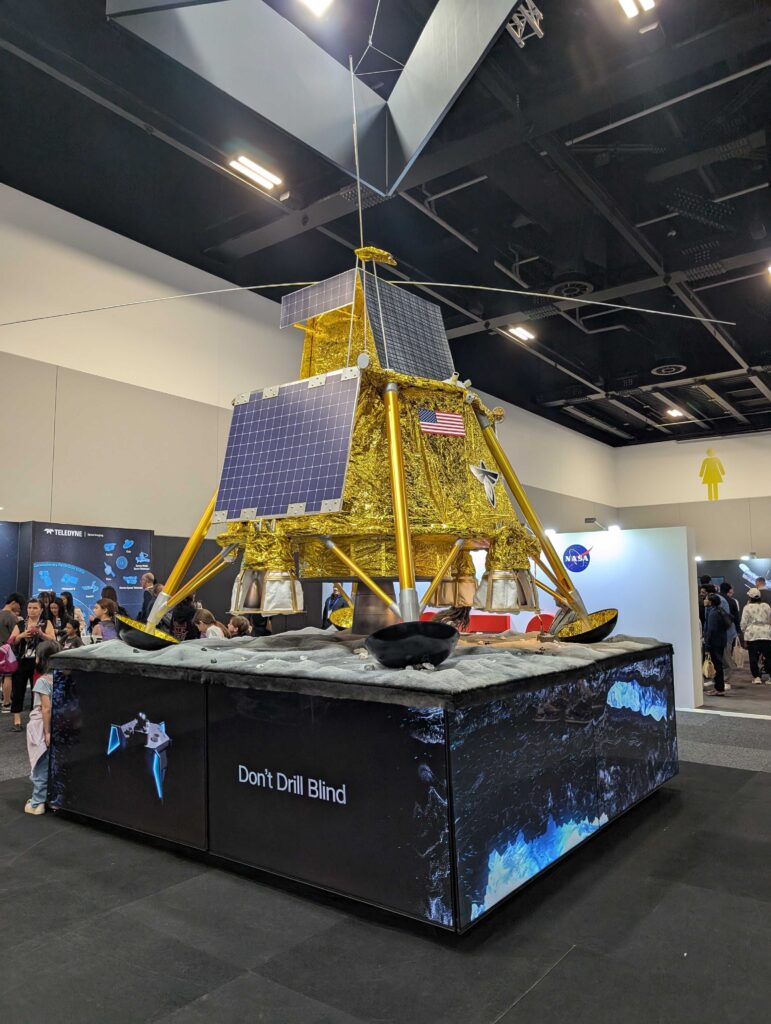 アメリカ航空宇宙局(NASA)ブースには大きな探査機の模型が設置され、記念撮影をする人々も見られましたが、最近の予算削減が影響しているのか、「ややさみしく見える」という声も