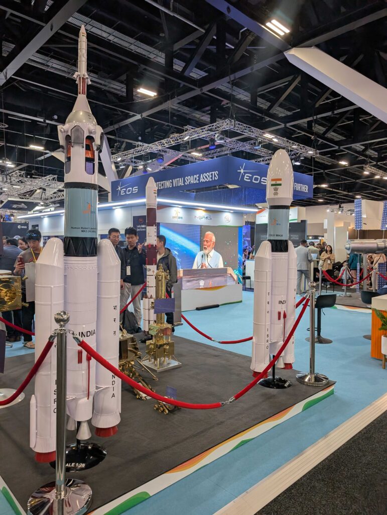 インド宇宙研究機関(ISRO)のブースでもロケットの展示が。加えてナレンドラ・モディ首相の映像が流されるなど、国を挙げて宇宙開発に取り組んでいる様子がうかがえました。また、ISROブース内には宇宙スタートアップの展示も見られました