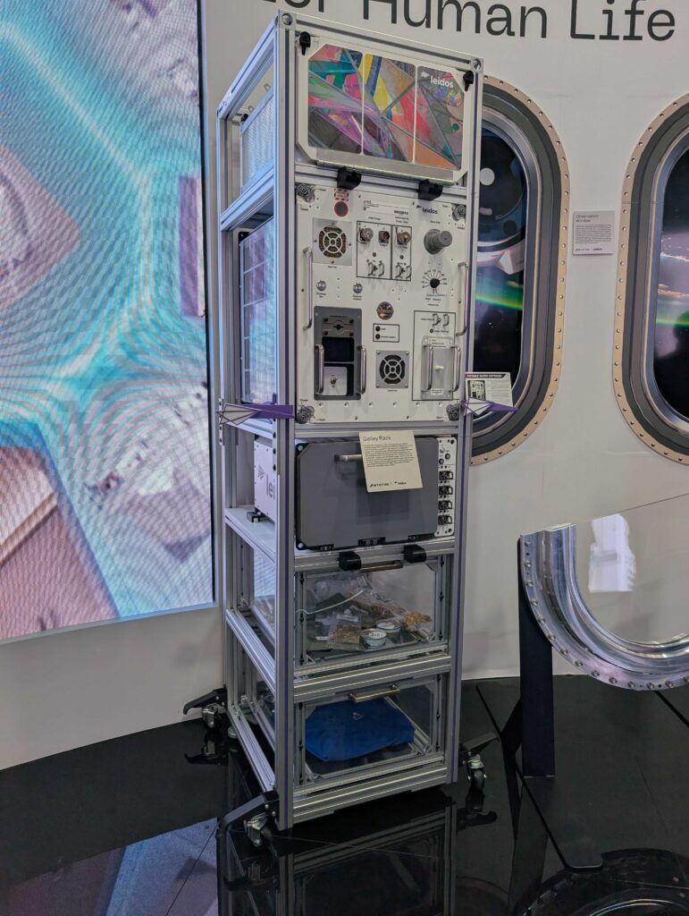 Starlabに設置される予定の実験装置ラックのモックアップ。取っ手を引き出すこともできるなど、かなり実際のものに近いつくりとなっていました。なお、右下に一部が写っているのはStarLabの窓の模型。ガラスの厚さは4〜5センチもあるそうです
